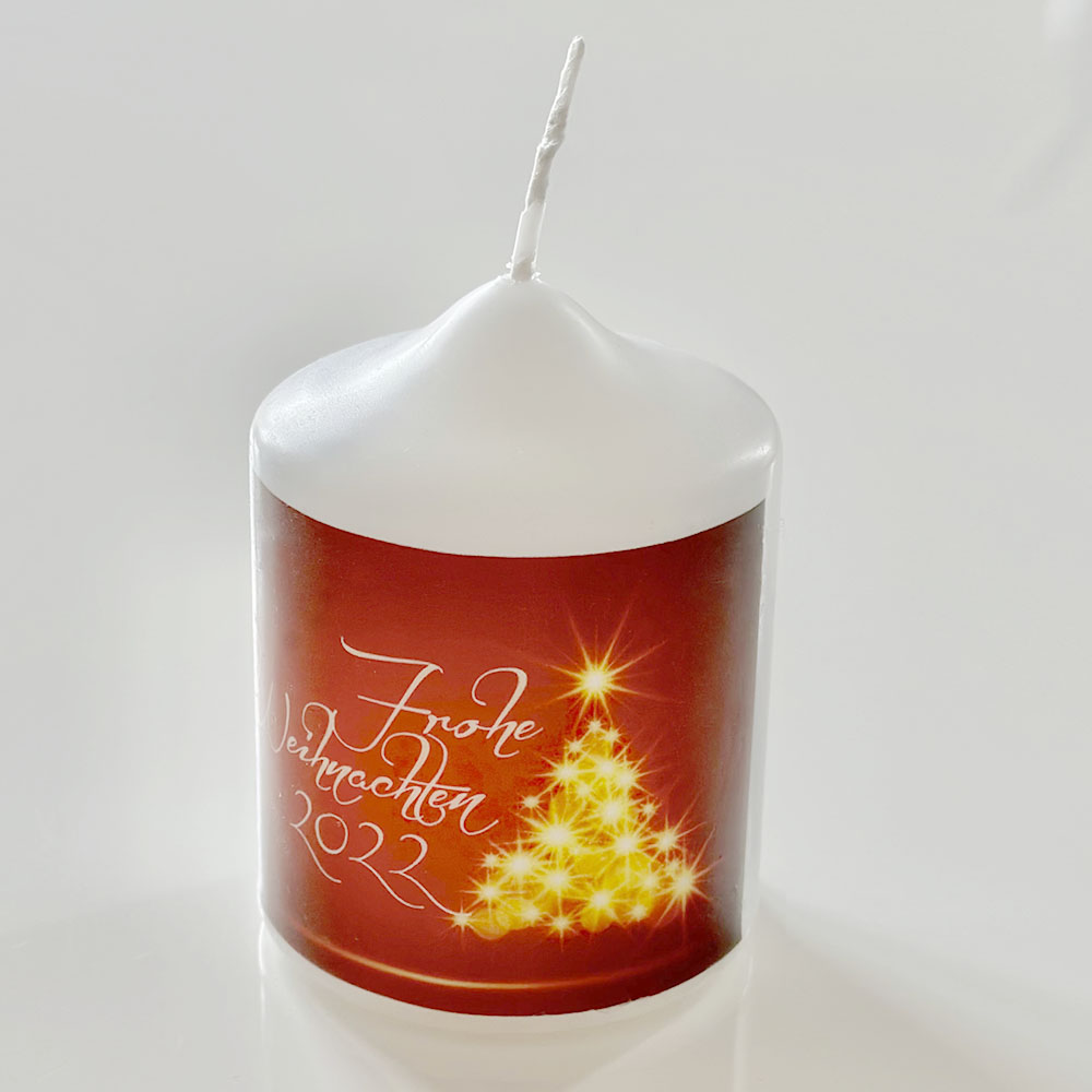 Rundum individuell bedruckte Kerze in 7 cm x 20 cm von Faust Printshop aus Bensheim. Geeignet für verschiedene Anlässe.